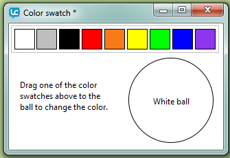 The example is based on the dragData property. The dragData contains whatever is currently being dragged--plain text, styled text, image data, or files--stored in an array whose keys are the data types that you can drag and drop. When the user starts the drag, you set the dragData to whatever is being dragged. When the drag ends, you use the contents of the dragData to perform the appropriate drop action. This example stores the color of the swatch in the "text" element of the dragData. When the user drops the swatch onto the "ball" graphic, the graphic's backgroundColor is set to the color name stored in the dragData.