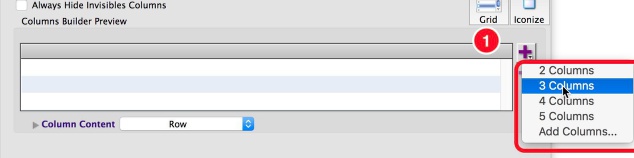 In the Preview area, click and hold the + (1) and select 3 Columns to set up three columns in our data grid.