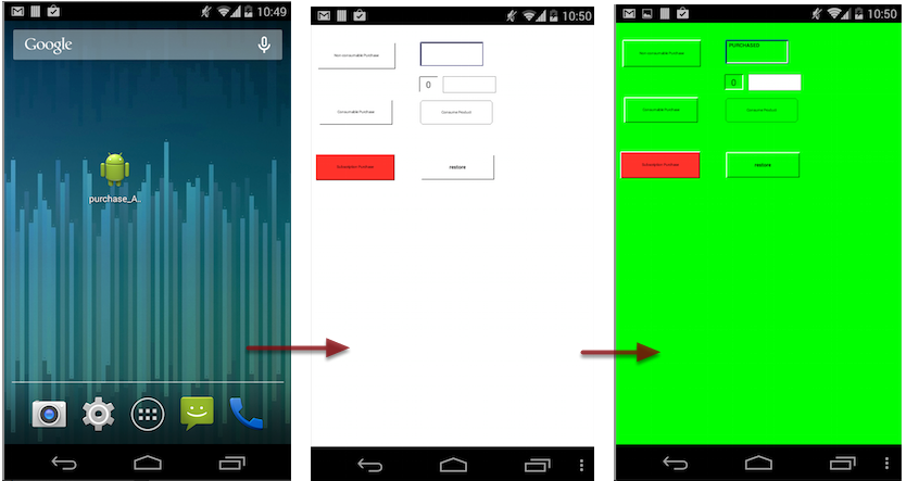 6. The app provides the user with the purchased item, i.e. the background becomes green.