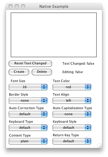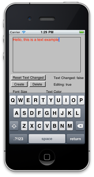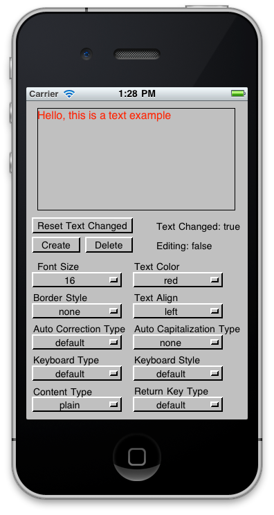 Once you raise your application on the iOS device of choice, you should be presented with the following or similar display. You have to select the button Create before you can start entering text. Once text has been entered (see next example), you should see how the label content of Text Changed and Editing changes. You can reset the Text Changed label by selecting the Reset Text Changed button. Selecting the option menus and altering their content should have an immediate impact on the content that is displayed in the text field.