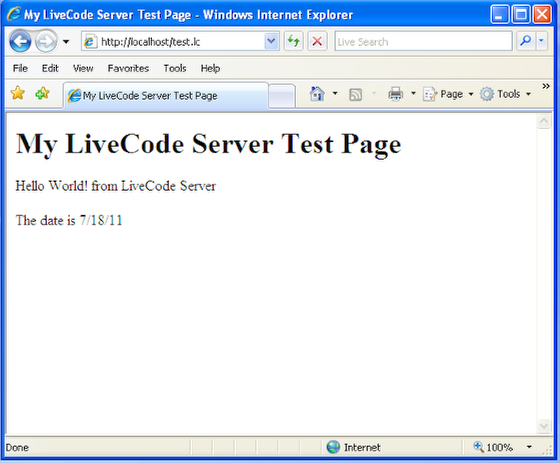 You are now ready to test your set up. To do this, create a file named "test.lc" in your "public_html" folder on your server. To access the test script, navigate to http://<your host>/test.lc using your browser. The above image shows the expected output if "test.lc" contains the following script: