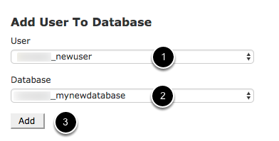 Scroll to the section Add User to Database. This allows you to assign the user to the database. The database name and the user name are prefixed with your account user name.