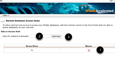 By default the access host is set to your server's IP address. This entry should be left. It is then possible to add specific IP addresses that are allowed to access the database. Enter the domain or IP address in the host field (2) and select Add Host (3). It is possible to add an arbitrary number of hosts to the list. To revoke an IP address's access simply click the "Remove" button (1).
