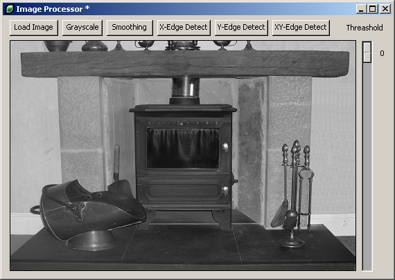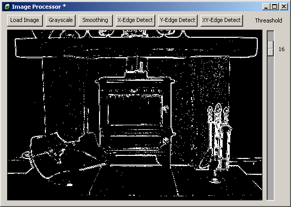 This algorithm uses the red color channel to test the value of a particular pixel, rather than the average of all red, green and blue values. This increases performance when moving the slider and assumes that images to be thresholded are grayscale, in which the red green and blue channels of a particular pixel are set to the same value.