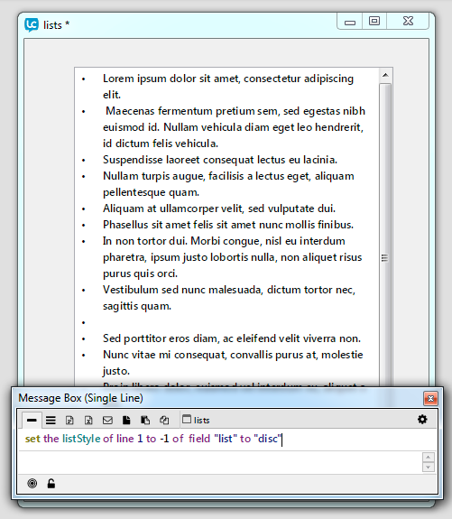 The listStyle property specifies what type of list style is to be used for a line of text. Setting the listStyle of a line, or number of lines in a field sets the bullet point for that line, or lines.