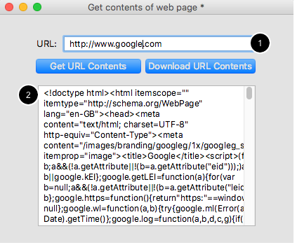 This lesson will show you two techniques for loading the content of a URL into LiveCode. In this screenshot you see that the content of http://www.google.com (1) has been loaded into a LiveCode field object (2).