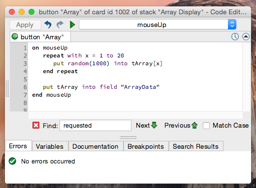 The first thing is to create a simple array for use in our tests, so copy the script below into the button's script and click the "Apply" button.