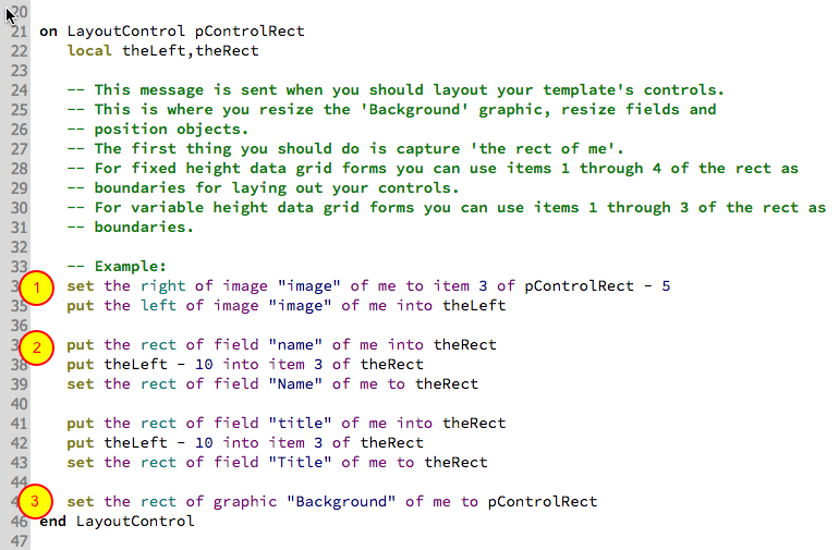 The LayoutControl message is where you position all of your controls. For this template you begin by positioning the image (1). Next you extend the "Name" and "Title" fields to the edge of the image (2). Finally you resize the "Background" graphic to fill the entire row rectangle.