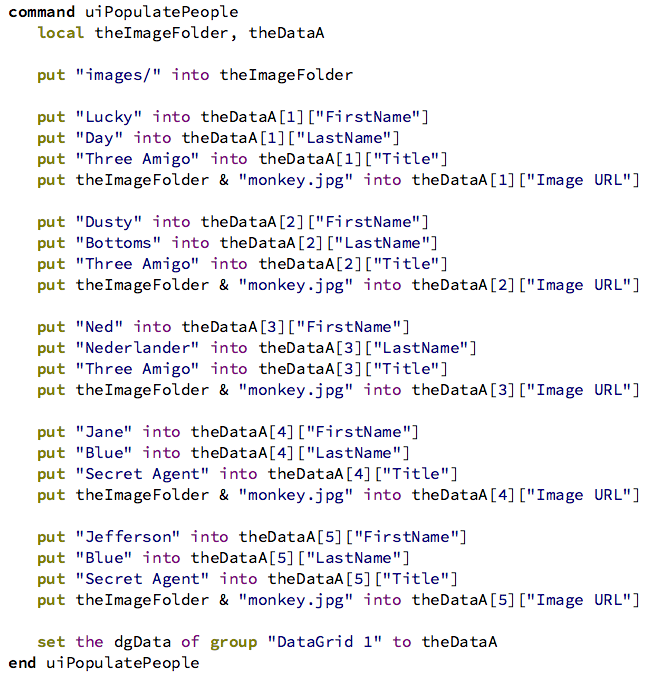 The dgData property of a data grid is a multi-dimensional array and is the actual format that the data grid works with under the hood. The data grid expects the first dimension of the array to be integers. The number of keys in the first dimension represents the number of records being displayed in the data grid. Here is an example with five records: