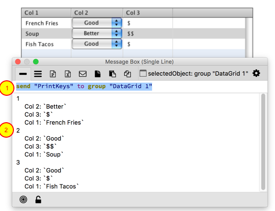 A data grid has a helper command that will print off the first line of each key in the internal data array. If you need to quickly see what the internal array looks like just send "PrintKeys" to the data grid (1). This will print the array in the message box (2).