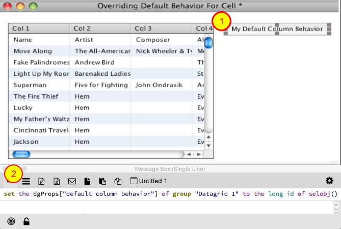 Now you can set the default column behavior property of the data grid. Select the button (1) and execute the following in the Message Box (2):