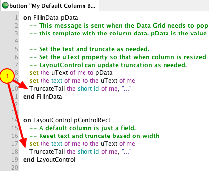 As an example, I will show you how to truncate the tail end of every cell whose content is too wide to fit. The data grid provides a helper command named TruncateTail that takes the short id of a field and a string that signifies the text is being truncated. I've added a call to TruncateTail to the FillInData and LayoutControl handlers so that cell contents are truncated when drawn or when a column is resized.