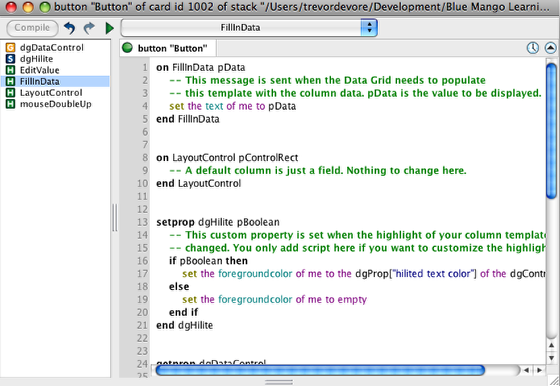 When creating your own default column behavior it is a good idea to start with the script that the data grid uses by default. You can copy the data grid default script easily enough by selecting the button (1) and executing the following statement in the Message Box (2):