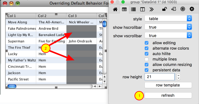 To see the results, click the Refresh Data Grid button in the Property Inspector (1). Notice how cell contents are no truncated as needed (2).