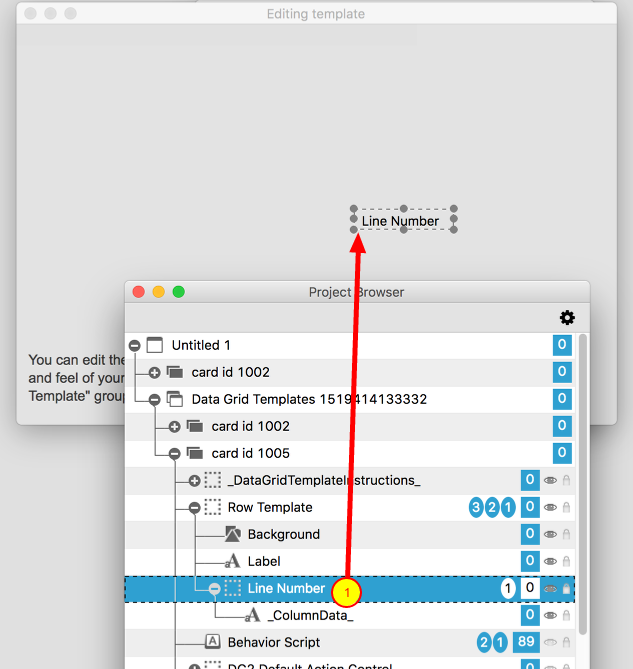 There isn't much to do here. In FillInData you just want to 'set the text of field 1 of me to the dgLine of me' (1). The dgLine is a property of a row template and this will display the line number for the current line. In LayoutControl you just need to set the rect of the field so that it fills the entire cell (2).